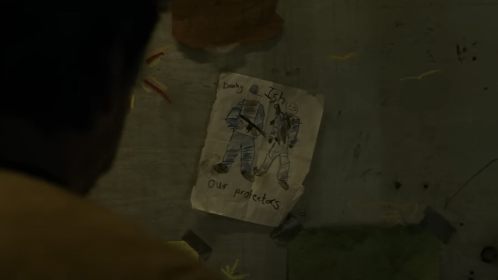Volviendo al presente, Henry convence a Joel de ayudarlo a escapar de la ZC, ya que el primero conoce el camino, pero necesita las habilidades del segundo. El escape de Kansas esta maravillosamente condensado, en particular la parte del túnel. En el juego, está sección es bastante larga y por medio de archivos nos cuenta la historia de Ish, su refugio y la pequeña comunidad que logró armas. Por razones de tiempo, medio y narrativa, esto no es adaptado. Sin embargo los showrunners decidieron incluir un montón de detalles como la guardería o los dibujos de los niños. Incluso el destino de los refugiados es resumido en unas pocas palabras por Joel: “alguien no cumplió las reglas y todos se infectaron”.