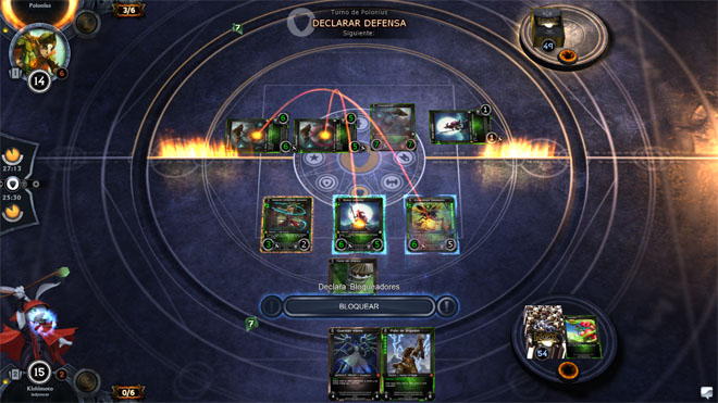 Luego de la charla llegó la hora de probar el juego. Nos batimos a duelo en una ronda PvP en la que, con el gran asesoramiento de Juan, pudimos salir victoriosos. La partida fue muy pareja y de hecho obtuvimos la victoria de forma casi inesperada, lo cual demuestra lo que nos contaban antes sobre las amplias posibilidades que ofrece cada juego. Hay que estar atento en todo momento de las acciones instantáneas que puede usar cada carta y también preguntarnos si alguna es preferible usarla en el momento o mas tarde. La regla principal es simple: cada jugador posee un campeón con 20 puntos de vida y debemos abatir al del otro. Claro que no siempre podemos atacarlo directamente ya que si posee tropas, éstas podrán bloquear el ataque. Pero hay que tener en cuenta que no siempre podría ser exitoso el bloqueo, a veces es mejor dejarnos golpear que perder alguna carta importante.