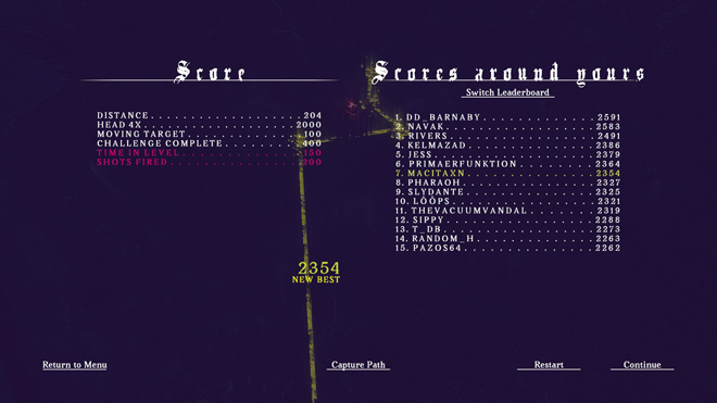 La estética del título es una gran parte del mismo, esa onda synthwave me enganchó mucho y, si bien al principio estaba medio extrañado por el gameplay, enseguida estaba reventando bochas a diestra y siniestra y rejugando niveles para conseguir un puntaje más alto. En la versión de prueba a la que tuvimos acceso había un chart con el puntaje de otros jugadores, por lo que será un punto de competencia seguro para los amigos que tengamos en las distintas plataformas. La historia resulta lo suficientemente llamativa y retorcida para ser intrigante, y la forma en que es contada a través de ilustraciones le da otra vuelta de tuerca.