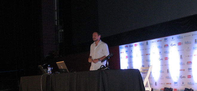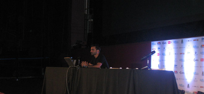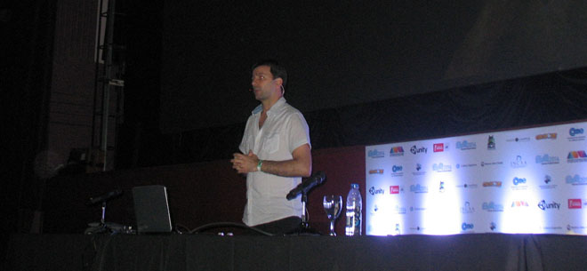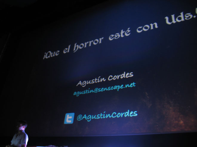 Agustín Cordes, conocido desarrollador argentino y creador de juegos como Scratches y el próximo Asylum, nos brindó una tremenda charla sobre el horror en los videojuegos y absolutamente todos los condimentos necesarios para que el jugador realmente sienta miedo. A lo largo de la presentación se hizo mucha mención de H. P. Lovecraft (muy conocido escritor de novelas de terror y suspenso), y se nombraron muchísimos juegos del género, comenzando con The Lurking Horror, Dark Seed, y también clásicos como Alone in the Dark y Silent Hill. Agustín demostró ser un genio en la materia, resumiendo cada juego, el tipo de terror que brindaba cada uno, que lo hacía especial o diferenciaba de los otros, etc. Incluso gente del público le preguntó opinión sobre algunos juegos del género y contestó como si los hubiera preparado.