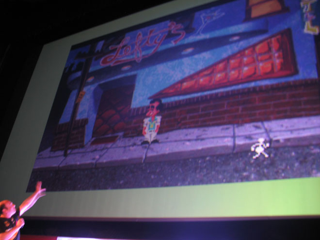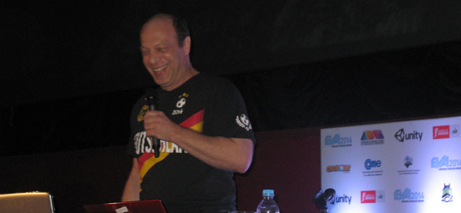 La EVA 2014 tuvo el honor de recibir a un speaker internacional de lujo. Fue Josh Mandel, muy conocido por sus trabajos como escritor y diseñador de Sierra Entertainment, quien contó su trayectoria en juegos como King's Quest (en el cual incluso fue la voz de King Graham). Al comienzo de la charla, recordó sus comienzos en el mundo artístico, que fueron alejados de los videojuegos ya que el era un comediante. Y realmente esto se notó ya que hizo explotar en carcajadas a la audiencia en varias ocasiones. De hecho, al iniciar la charla exclamó que tenía calor por lo que se quitó su camisa... para revelar que debajo tenía puesta una camiseta de Alemania. Ni hace falta explicar el chiste y todos nos reímos mucho; Josh exclamó,