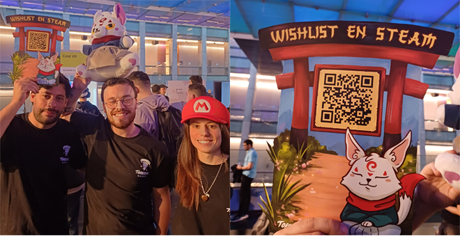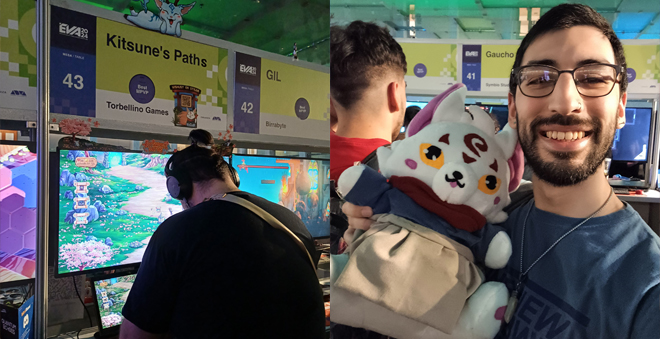 Pero claro, ¿por dónde empezar?. Con más de 60 juegos en exposición y un primer día de la EVA Play explotado cuando recién había iniciado (el viernes 25 de octubre), empecé tímidamente a caminar por los diferentes stands pensando "a quien molestar primero". Y fue ahí cuando aparecieron ellos, un trío que, imagino, todos los asistentes de EVA 2024 se habrán cruzado, porque no sólo estuvieron por todas partes promocionando Kitsune's Paths, sino que a su vez llevaron cargando en hombros a Zenko, el adorable protagonista del juego. Por supuesto, Zenko se sacó fotos con mucha gente, incluyéndome.