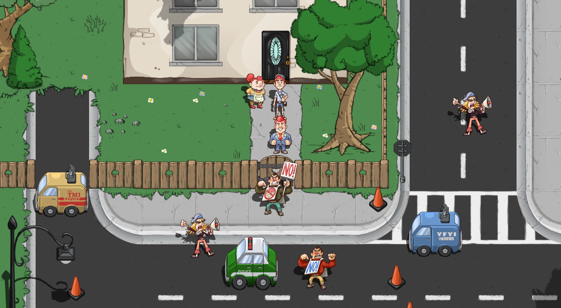 Comenzar el juego de Citizens of Earth es el sueño cumplido gamer de Giorgio Tsoukalos. Despertándote como el Vicepresidente de la Tierra (típico hedonista medio papa frita) al borde de una impresionante protesta, todos quieren tu cabeza colgada en la pared de sus hogares. Sin saber ni como ni el por qué, te arrastra cada ciudadano a una conspiración alienígena, cuando lo único que te importaba era tomarte un café en Moonbucks (¿derechos de autor reservados?) para pasar el día luego de las elecciones. Los primeros en caer a la bolsa de guardaespaldas en tu equipo son tu madre y tu hermano. Sumando pistas se te une un paranoico flaco que indica que el café le está lavando el cerebro a la gente. Tu séquito serán el panadero, los policías y otros coloridos personajes, cada uno con talentos y frases especiales. Por supuesto, no te ensuciás las manos, ya que toda la gente que reclutes, pelea por vos.