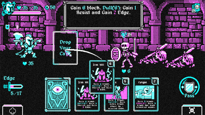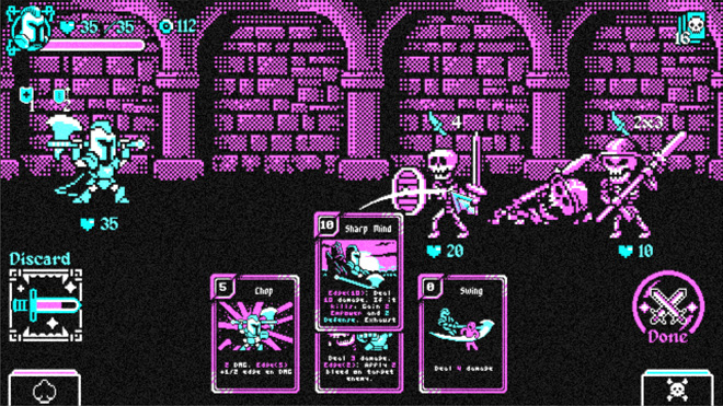Es un deckbuilder roguelike con estética ochentosa y una paleta CGA, en donde no solamente vos podés crear tu deck, sino que también podés mejorar tu arma (la cual te da nuevas cartas), y al mismo tiempo tenés que elegir si usar tu carta en defensa o en ataque. Ésto genera un montón de diferentes estrategias. ¿Cómo hacen para no volverse locos creando tantas cartas con sus propias características?