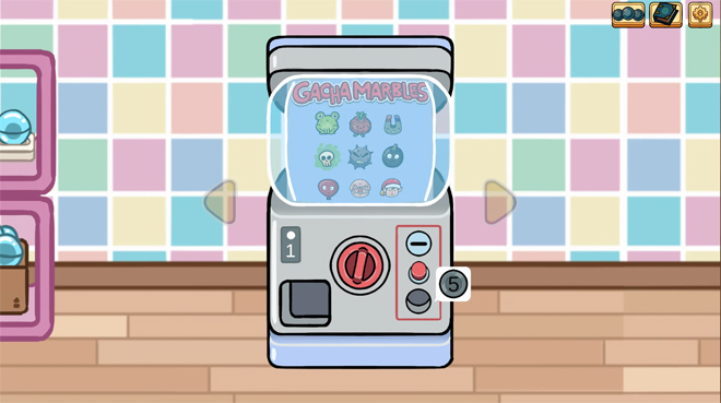 Es un juego que combina la máquina de gachapones con el juego de canicas. Entonces vos tenés que jugar a las canicas y competís. A su vez es un coleccionador de criaturas, porque las canicas no tienen forma de canica, sino que tienen forma de monstruos; son todas diferentes y tienen un poder especial. Entonces, las batallas ahí son todas locas; por ejemplo, hay un imán que atrae a las demás, y la batalla es por conquistar zonas. Vos conquistás zonas y vas sumando puntos. El que llega a una determinada cantidad de puntos gana, y con eso vas juntando moneditas. Con éstas tirás en la máquina de gachapones y te salen al azar nuevas canicas.