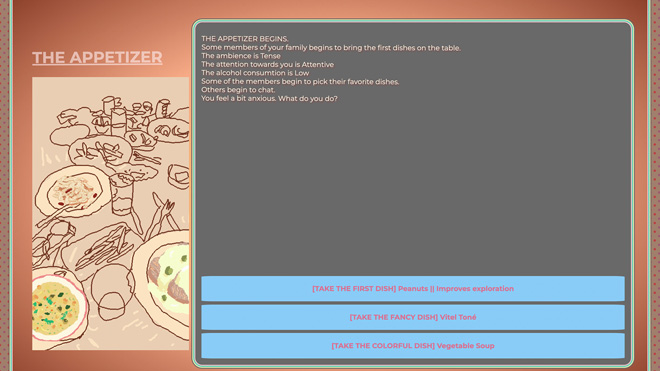 Supongo que sí jajaja, no mentira. Está un poco inspirado en recuerdos de cuando era más chico. Yo ya trabajé en otros proyectos, y me puse a juntar recuerdos de la infancia y esas cosas, y Family Reunion se fue dando por ahí. Me gusta, por ejemplo, Papers Please, que toma la dinámica de un puesto de aduana o control de frontera. Me quedó esa idea, y pensé en cosas que se puedan aplicar a esa lógica en un juego, pero con una situación de la vida. ¿Cómo decidiste ir artísticamente por este lado?
