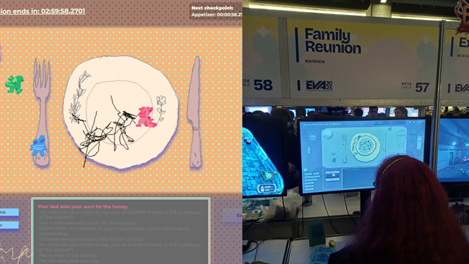 Family Reunion te ubica en el lugar de un chico a los 7 años sentado en la mesa familiar, y que quiere hacer cualquier cosa menos estar ahí. El tiempo pasa muy pero muy lento. Y tenés que empezar a tomar acciones en la mesa para poder divertirte y que termine lo antes posible.