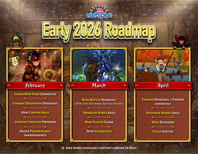 La hoja de ruta de Eterspire para principios de 2026 se acerca a su etapa final. Varias adiciones importantes están actualmente en desarrollo, entre ellas la zona de Pantano de Bogtown, un sistema de Gremios, y una revisión del skill de pesca. Una nueva hoja de ruta para el próximo trimestre será revelada próximamente.